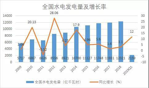 利用小時數(shù)的升高明顯的體現(xiàn)在了發(fā)電量上。2019年一季度,水電為2159億千瓦時,同比增長12%,增速比上年同期提高9.4個百分點。