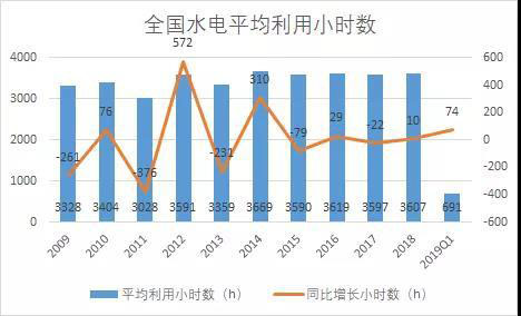 于是,近兩年水電利用小時數(shù)得到有效改善。2018 年全國水電設備平均利用小時為 3613 小時,較 2017 年略微增長。而2019年第一季度,利用小時數(shù)又同比增加74小時。