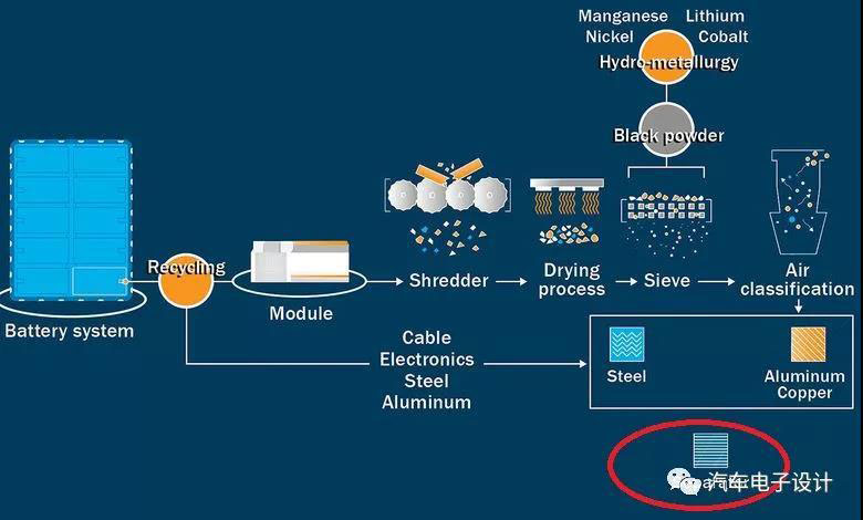 后段:把電池模組進(jìn)入粉碎機(jī),把整個(gè)模組切碎,然后烘干,通過特殊的機(jī)器進(jìn)行篩選分解出黑色粉末(鎳,錳,鈷和鋰),最后通過分離的機(jī)械分解出鋼、隔膜、鋁和銅。