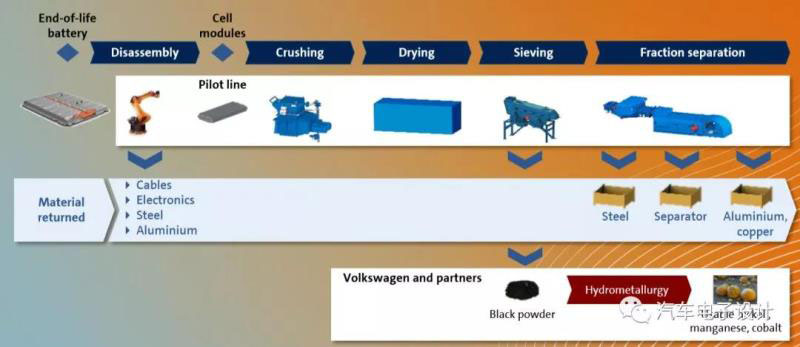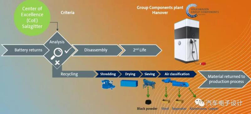 整個(gè)工藝過程如下圖所示,可以看到大眾考慮這件事情,是把模組作為最小的單元,模組以下就是統(tǒng)一機(jī)械化處理。所以這個(gè)模組整體是要能拆解的,而模組本身維修也好,后續(xù)分解也好作為一個(gè)整體。