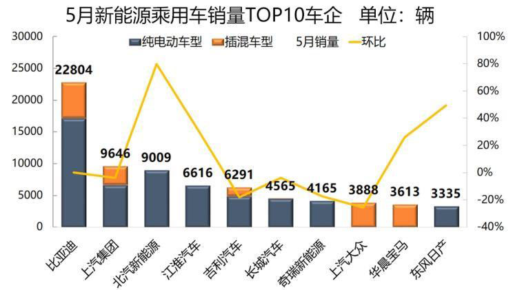 純電動市場上則玩家眾多,有46家車企參與,市場集中度不高,5月份前十位車企的合計市場份額為81%。