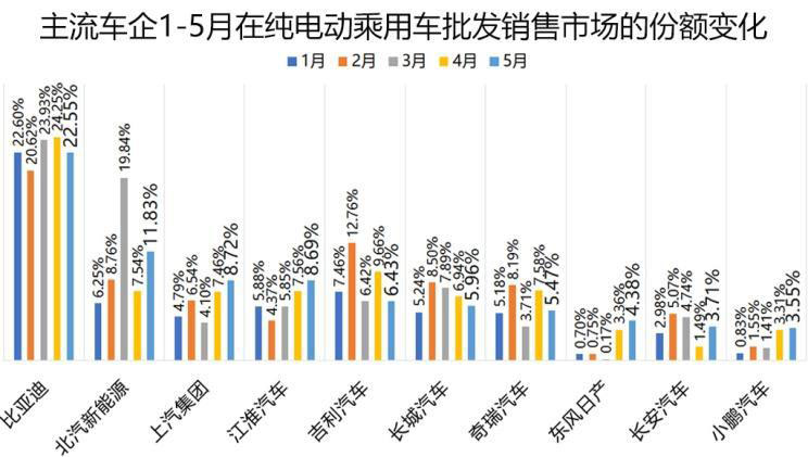下圖中的十家車企中,在純電動板塊的市場份額穩(wěn)步提升的是東風(fēng)日產(chǎn)和小鵬汽車。另一家比較引人注目的新勢力蔚來汽車今年前五個月在純電動板塊的市場份額依次是2.5%、1.7%、1.5%、2.3%和1.4%。
