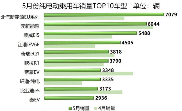 冠軍車企仍然是比亞迪,2.28萬輛的銷量較4月微增0.68%,其中純電動車型銷售1.72萬輛,占比75%。上汽集團銷量減少3.67%,不足萬輛,其中純電動車型銷售6642輛,占比69%。北汽新能源從上月的第7位躍升至第三,借力EU系列和EX系列大漲80%。