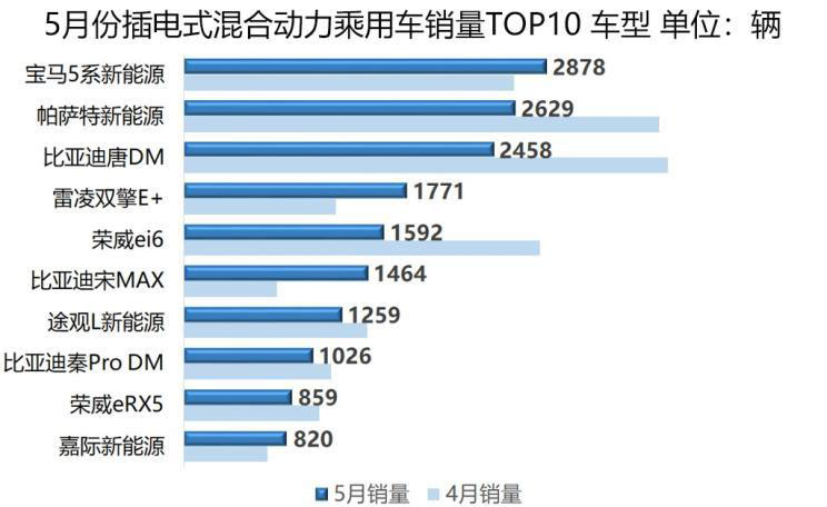 在5月的插電式混動車型單車銷量Top 10榜單上,比亞迪旗下車型3款,上汽集團榮威品牌2款,吉利新能源1款,合資品牌插電式混動車型4款??_拉雙擎E+本月銷量銳減53%,只賣出了638輛,跌出Top 10榜單。