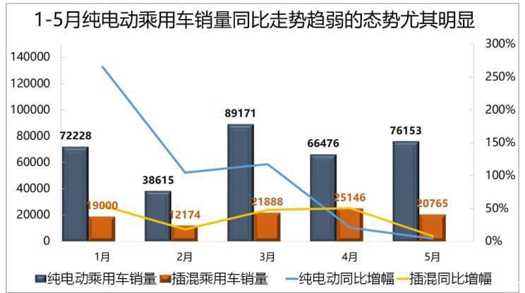然而,今年以來,純電動乘用車板塊的市場走勢月月趨弱,月度同比增幅從3倍、翻倍銳減到5月的4.28%——5月份純電動乘用車批發(fā)銷售76153輛,環(huán)比增長14.56%,同比增長4.28%,弱于新能源整體市場;插電式混動乘用車批發(fā)銷售20765輛,同比增長8.37%,環(huán)比減少17.42%。