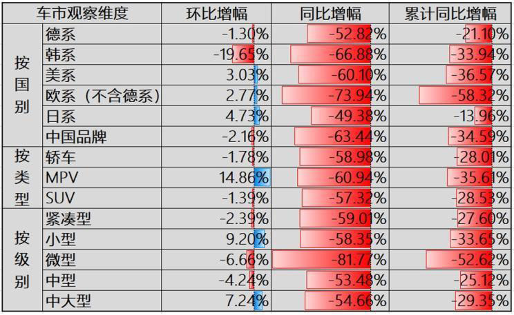 從乘用車品牌所屬國別、乘用車類型、車型級別的各個維度審視,每一維度的同比降幅也都進一步加深,50%簡直就是“入門水平”。夏至未至,國內(nèi)車市卻已身陷寒冬。