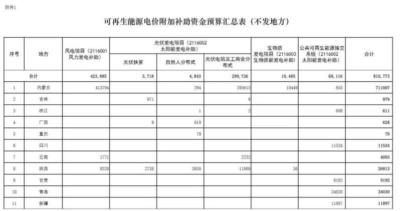 從地域分布可以看出,內(nèi)蒙古大部分的可再生能源裝機(jī)都集中在蒙西電網(wǎng)轄區(qū)內(nèi),故在此次公示的補(bǔ)貼中,內(nèi)蒙古自治區(qū)獲得的補(bǔ)貼總額度約為71億,約占90%左右。此外,青海、新疆等國家電網(wǎng)轄區(qū)內(nèi)的省份出現(xiàn)在上表中,是因?yàn)檫@些區(qū)域集中了大量的公共可再生能源獨(dú)立系統(tǒng)。