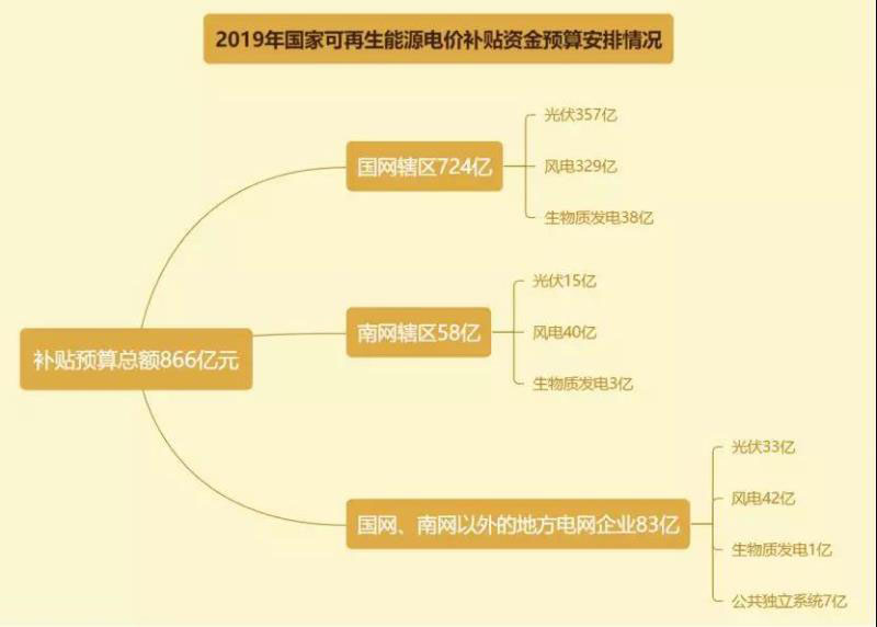 據(jù)國家可再生能源信息管理中心發(fā)布的數(shù)據(jù)顯示,2019年國家可再生能源電價(jià)補(bǔ)貼資金預(yù)算總額約為866億元,具體分配情況見下圖。其中,財(cái)政部于6月5日公示的共計(jì)81億元補(bǔ)貼資金預(yù)算僅為地方電網(wǎng)轄區(qū)內(nèi)可再生能源裝機(jī)的補(bǔ)貼(詳情可點(diǎn)擊查看《11省獲81億元可再生能源補(bǔ)貼,財(cái)政部發(fā)放今年首批可再生能源電價(jià)附加補(bǔ)助資金》)。