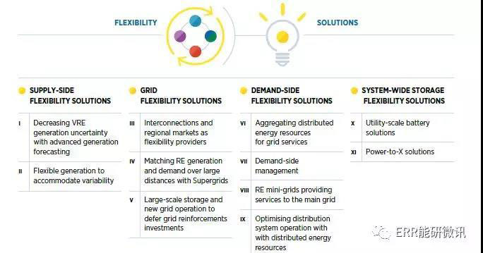 此案例表明,具有實(shí)際影響的實(shí)際解決方案來自創(chuàng)新的組合。正確的組合和最佳解決方案對(duì)于每個(gè)國(guó)家可能不同,但許多國(guó)家都有共同點(diǎn)。將這4個(gè)維度的創(chuàng)新相結(jié)合所產(chǎn)生的解決方案降低了電力系統(tǒng)成本。國(guó)際可再生能源署已詳細(xì)闡述了11種解決方案,以提高電力系統(tǒng)的靈活性,以說明如何結(jié)合創(chuàng)新,從而在針對(duì)間歇性可再生能源集成的定制方法中產(chǎn)生效果。