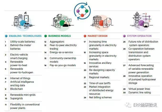 正如國(guó)際可再生能源署的工作所證實(shí)的,沒有一個(gè)單一能改變游戲規(guī)則的創(chuàng)新。任何孤立的創(chuàng)新都不可能產(chǎn)生重大影響,而是需要伴隨著電力所屬部門的創(chuàng)新。國(guó)際可再生能源署調(diào)查了大量創(chuàng)新的前景,這些創(chuàng)新可促進(jìn)將高份額間歇性可再生能源融入到電力系統(tǒng)中,確定并集合了30項(xiàng)變革性創(chuàng)新,包括支持技術(shù)、業(yè)務(wù)模型、市場(chǎng)設(shè)計(jì)和系統(tǒng)操作。