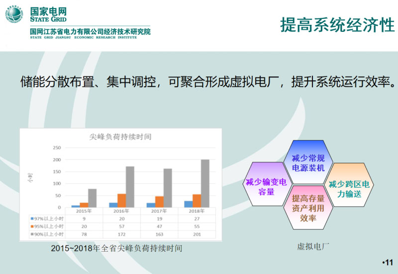 對于儲能來說,下面這個圖是儲能來滿足尖峰負(fù)荷效果的說明,這個圖是一個典型的早上9點到晚上23點的尖峰負(fù)荷的曲線,可以看出來它的負(fù)荷是早晚兩高峰,特征比較明顯,兩條紅線之間的300尖峰負(fù)荷它的持續(xù)時間其實是比較短的,如果用儲能來搬移電量,對儲能的容量需求不大。儲能的投資其實主要是和兆瓦時和容量有關(guān)系,如果持續(xù)時間比較短通過儲能把它搬移掉,其實投資不是很大。下面需要它搬移的電量增大以后可以通過抽水蓄能,調(diào)峰燃機或者其他可調(diào)節(jié)電源來進(jìn)行資源組合,實現(xiàn)自上而下的資源調(diào)節(jié),不像傳統(tǒng)的方式只通過建電廠或者建線路來滿足調(diào)峰手段,兼顧系統(tǒng)里面能量型和功率型協(xié)調(diào)的發(fā)展,應(yīng)用了儲能功率調(diào)節(jié)的作用。