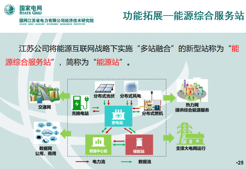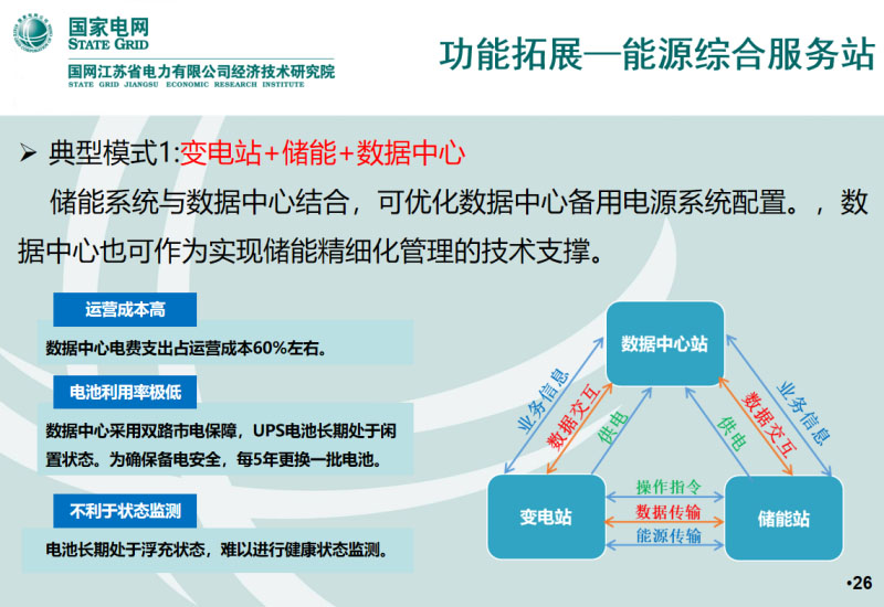 我們現(xiàn)在正在做的另外一個研究是關(guān)于三站合一的,2019年國網(wǎng)公司提出了三站合一的研究,江蘇公司將能源互聯(lián)網(wǎng)戰(zhàn)略實施“多站融合”的新型站稱為能源綜合服務(wù)站,簡稱為能源站。如果用了儲能的話,相當(dāng)于可以考慮用儲能來替代UPS的電池。