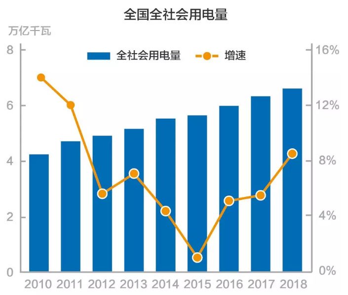 用電量歷來被稱為經(jīng)濟(jì)增長的“晴雨表”。當(dāng)然,二者之間在特殊的年份有可能“脫鉤”,比如2018年用電量增幅再次高于GDP增幅。但從長期看改變不了用電量與經(jīng)濟(jì)的正相關(guān)關(guān)系。過去10年用電量的低速增長就證明了這一點,這也是國家宏觀調(diào)控政策穩(wěn)中求變、不斷發(fā)力的結(jié)果。