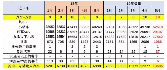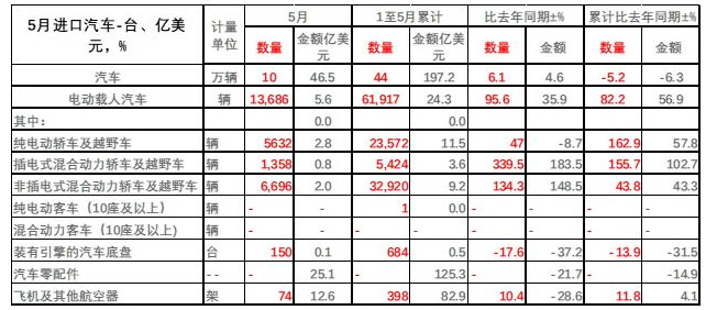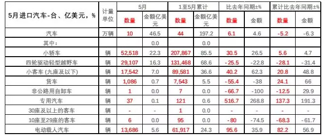5月汽車進口10萬臺,同比增長17%,其中5月份進口小轎車4.9萬臺,同比增長54%,而小客車進口2.5萬臺,同比增長97%。