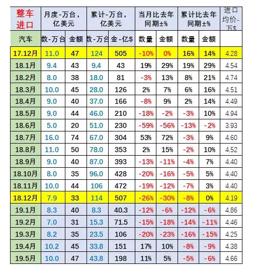 由于進口車型檔次提升和對美關稅在2019年1月調(diào)整的影響,以及3月末增值稅的調(diào)整,2019年1-5月,中國汽車進口198億美元增-6%,其中5月進口47億美元,同比增5%,環(huán)比4月的45億美元增長2億美元。
