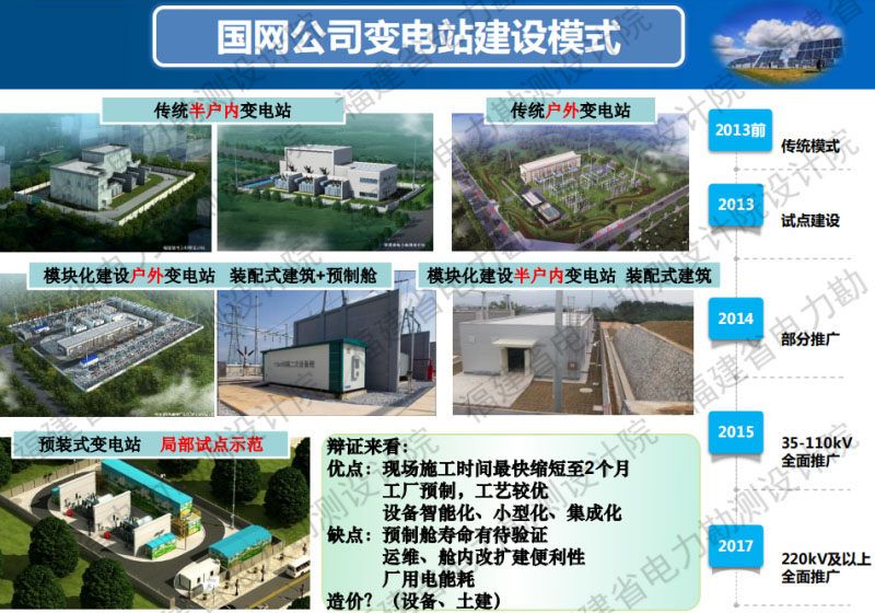首先介紹一下預(yù)制艙式的電力設(shè)施,實(shí)際上預(yù)制艙式在電力系統(tǒng)領(lǐng)域早有先例,早在2013-2014年國(guó)網(wǎng)即開始試點(diǎn),模塊化智能站、新一代智能站先后開始大范圍調(diào)研、示范建設(shè)、逐步推廣。2015年開始35-110kV的變電站已全面推行模塊化建設(shè)的模式,2017年220kV及以上變電站也開始全面推廣模塊化建設(shè)模式。上圖是傳統(tǒng)建設(shè)方式的智能變電站,有戶內(nèi)、半戶內(nèi)和戶外三種方式。最上面的三個(gè)圖就是傳統(tǒng)的智能變電站,它一般以戶內(nèi)、半戶內(nèi)還有戶外這三種主要的模式,戶內(nèi)就是所有的設(shè)備都放在混凝土建筑內(nèi),戶外變就是只有二次設(shè)備放在戶內(nèi),其他的一次設(shè)備都放在戶外。中間三幅圖是模塊化建設(shè)模式的智能變電站,戶外變采用裝配式建筑+預(yù)制艙的建設(shè)方案,對(duì)于戶外變電站我們一般采用裝配式建筑還有預(yù)制艙兩個(gè)相結(jié)合,預(yù)制艙內(nèi)安裝二次設(shè)備,布置在一次設(shè)備的附近。對(duì)于戶內(nèi)變,所有設(shè)備都是放在鋼結(jié)構(gòu)的站房?jī)?nèi)。裝配式建筑一般是采用鋼結(jié)構(gòu)的建筑,外墻一般采用合金板,最大優(yōu)點(diǎn)就可以現(xiàn)場(chǎng)沒(méi)有濕法作業(yè),大部分設(shè)備的安裝、調(diào)試都是在工廠里面預(yù)制完成的。