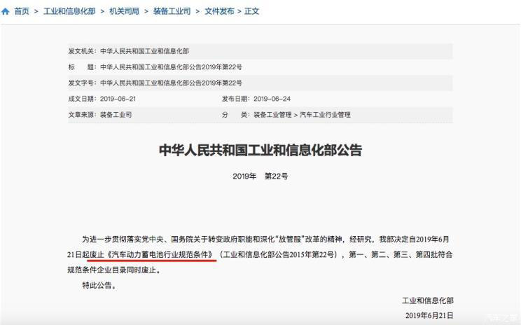中國儲能網(wǎng)訊:國內(nèi)新能源汽車動力電池領(lǐng)域迎來了一個重磅消息。6月24日,工業(yè)和信息化部(以下簡稱“工信部”)官網(wǎng)發(fā)布文件稱,為深化“放管服”改革的精神,工信部決定自2019年6月21日起廢止《汽車動力蓄電池行業(yè)規(guī)范條件》(工業(yè)和信息化部公告2015年第22號),第一、第二、第三、第四批符合規(guī)范條件企業(yè)目錄同時廢止。這意味著,在業(yè)內(nèi)存在近4年的新能源汽車動力電池“白名單”正式取消。