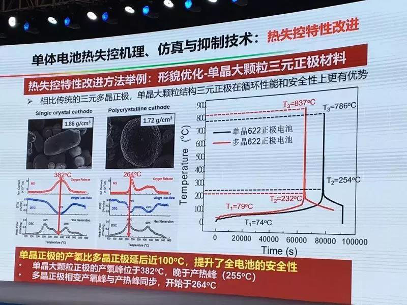 這里只展示其中一種方法,對(duì)正極材料的形貌優(yōu)化,將傳統(tǒng)三元多晶正極優(yōu)化為單晶大顆粒結(jié)構(gòu)的三元正極,單晶正極的產(chǎn)氧比多晶正極延后了100℃,熱失控最高溫度也有所降低。