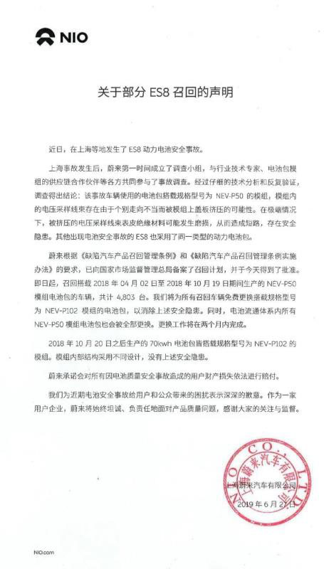 因為電池設計問題,蔚來汽車有限公司于6月27日針對部分ES8進行召回。作為ES8電芯的供應商,寧德時代發(fā)布了針對這次召回計劃的聲明,該公司表示:“對此事高度重視,將積極配合蔚來汽車的此次召回工作,維護消費者權益。”