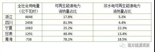 浙江省是五個(gè)國家清潔能源示范?。▍^(qū))之一,是唯一一個(gè)東部省份,其他四個(gè)分別是四川、寧夏、甘肅、青海。從可再生能源電力消納量占本省全社會(huì)用電量指標(biāo)來看,浙江遠(yuǎn)低于其他四?。▍^(qū)),非水電可再生能源電力消納量占比只有5.3%,僅高于四川。