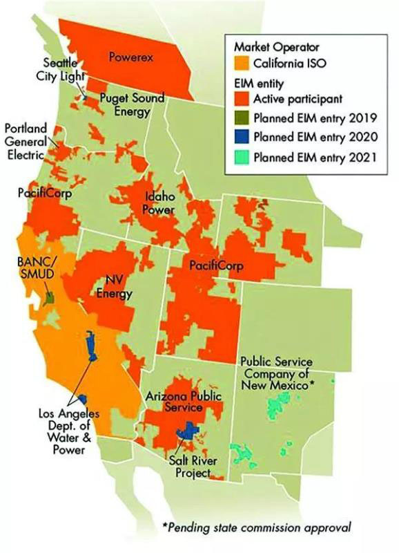 2014年11月1日,加州電力調(diào)度中心(CAISO)啟動(dòng)了電力不平衡市場(chǎng)(EIM)構(gòu)架。這是一個(gè)跨區(qū)域的實(shí)時(shí)市場(chǎng),覆蓋了華盛頓州、加利福尼亞州等8個(gè)州市,并向加拿大拓展。