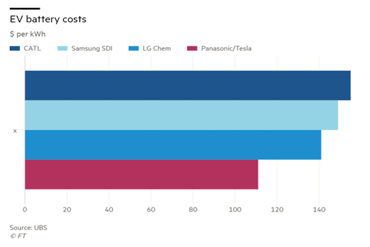 一個最具說服力的數(shù)據(jù)是2018年11月瑞士聯(lián)合銀行(UBS)對松下、LG化學(xué)、三星SDI和寧德時代的電池進行測試評估,其中特斯拉超級工廠生產(chǎn)的松下電池成本是0.11美元/瓦時(約合人民幣0.76元/瓦時),遠低于其他三家競爭對手,其中寧德時代的電池成本約0.15美元/瓦時(約合人民幣1.03元/瓦時),在四家企業(yè)中成本最高。