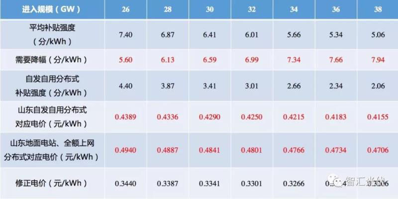 2)假設(shè)一個(gè)進(jìn)入盤子的規(guī)模,就可以獲得一個(gè)平均的補(bǔ)貼強(qiáng)度;以加權(quán)平均0.13元/kWh為基礎(chǔ),從而獲得平均的補(bǔ)貼降幅;