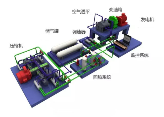 簡(jiǎn)單來(lái)說(shuō),就是將低谷電、棄風(fēng)電、棄光電等不易儲(chǔ)藏的電力儲(chǔ)存在壓縮空氣中,將其轉(zhuǎn)化為空氣分子的內(nèi)勢(shì)能。當(dāng)用電高峰到來(lái)之時(shí),再把高壓空氣的分子勢(shì)能釋放出來(lái)做功發(fā)電,從而改善發(fā)電與用電的時(shí)空結(jié)構(gòu)。