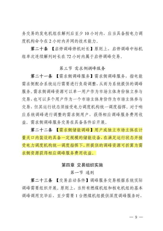 此外,在第二十二條還指出,【需求側儲能調峰】用戶或獨立市場主體在計量關口內裝設的具備一定規(guī)模的儲能設備,在滿足運行狀態(tài)并接受電力調度機構統(tǒng)一調度指揮下,所提供的調峰資源可折算為需求側資源獲得相應調峰服務費用收益。