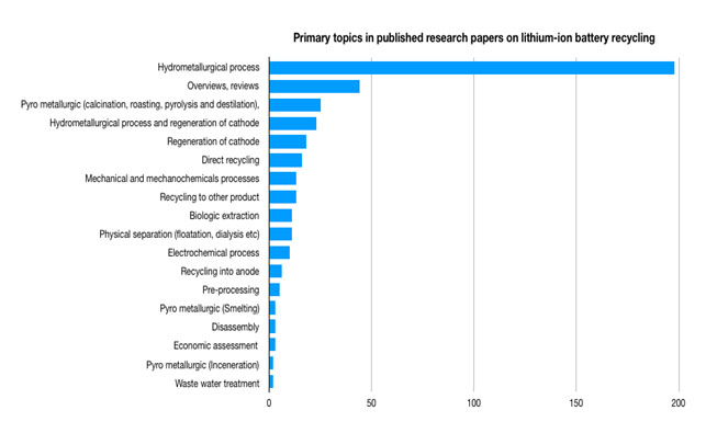 在全球范圍內(nèi),在分離和回收廢舊電池和陰極材料重新利用方面進(jìn)行了300多項(xiàng)初步研究,其中70%的研究是由中國和韓國的電池生產(chǎn)商進(jìn)行的,并發(fā)現(xiàn)所有的活性材料(包括金屬鋰)都可以高效回收。