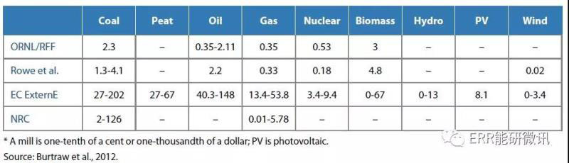 表ES.2:4項外部成本研究的估算匯總(mills*每千瓦時或美元/每兆瓦時)