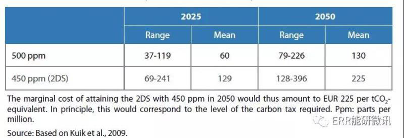對大量不同氣候和能源模型中建立的2ds對應的邊際成本進行綜合分析,得出了2025年和2050年450和500ppm濃度目標的邊際減排成本(MAC)值(見表ES.1)。這些數(shù)值意味著到2025年每噸二氧化碳的成本至少為100美元,到2050年每噸二氧化碳的成本至少為200美元。
