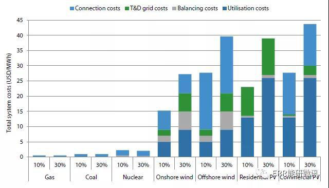 圖ES.3 VRE占10%和30%份額的發(fā)電技術的電網(wǎng)級系統(tǒng)成本