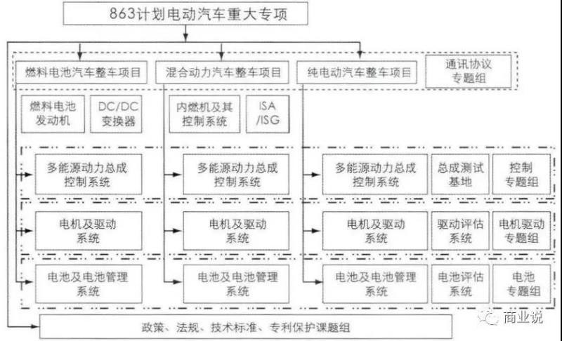 三縱是指插電式混合動力汽車、純電動汽車、燃料電池汽車;三橫是指多能源動力總成控制系統(tǒng)、電機(jī)及其控制系統(tǒng)和電池及其管理系統(tǒng)?!叭v”是不同階段的產(chǎn)業(yè)化目標(biāo),“三橫”則是實(shí)現(xiàn)不同階段產(chǎn)業(yè)化目標(biāo)的技術(shù)基礎(chǔ)。