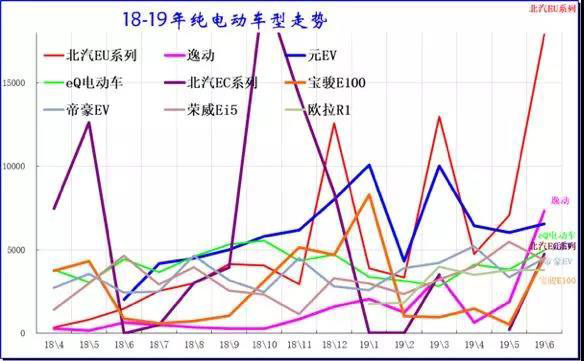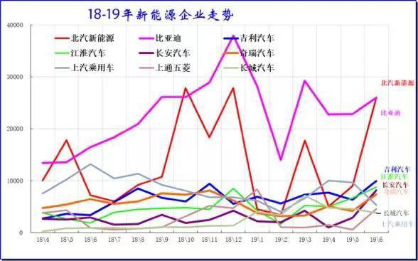 北汽新能源車的波動性增長較強,18年的4季度連續(xù)增長較強,4月環(huán)比3月回落較大,但6月快速回升,并超越比亞迪成為銷量冠軍。