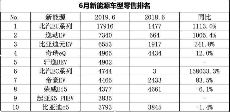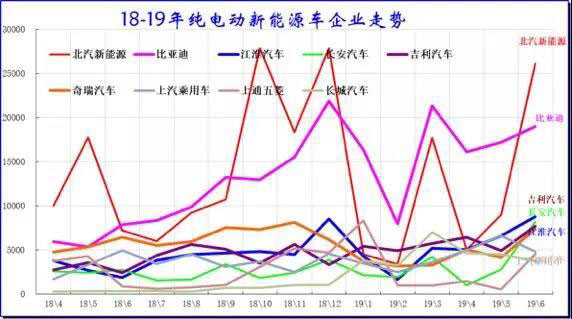 2019年6月的北汽新能源沖刺超強,成為增量核心主力。江淮汽車的純電動的表現(xiàn)也是很好的。