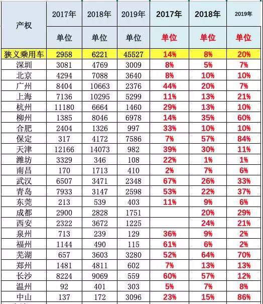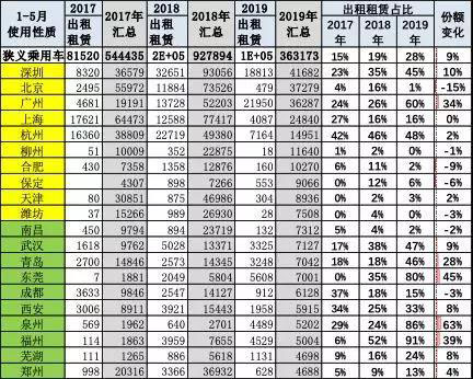 北京由于6萬指標限制,沒有持續(xù)放號,指標缺乏,因此19年5月北京銷量增表現(xiàn)一般。貴陽、廈門、福州等的出租租賃比例較強。