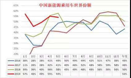 2019年1-5月的中國新能源車的地位在世界份額持續(xù)提升到53%,處于歷史最高水平。