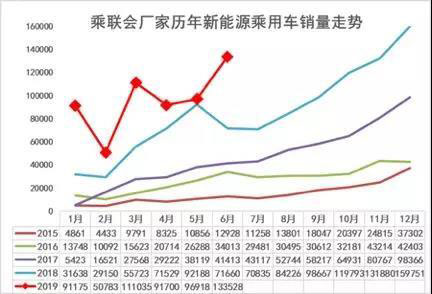 2019年新能源車的開局良好,2019年1月批發(fā)達到9.1萬輛,2月因多種因素回落到5萬輛,3月的退坡效應(yīng)達到11萬輛。4月的補貼新政實施期,廠家銷量達到9.17萬輛。5月新能源廣義乘用車批發(fā)達到9.7萬輛。6月13.4萬輛,同比增長6.2萬輛,表現(xiàn)很好。