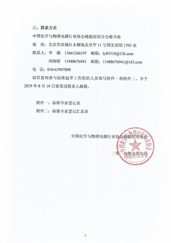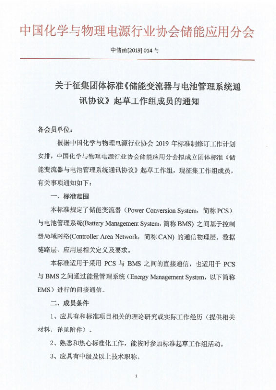 根據(jù)中國化學(xué)與物理電源行業(yè)協(xié)會2019年標(biāo)準(zhǔn)制修訂工作計劃安排,中國化學(xué)與物理電源行業(yè)協(xié)會儲能應(yīng)用分會擬成立團(tuán)體標(biāo)準(zhǔn)《儲能變流器與電池管理系統(tǒng)通訊協(xié)議》起草工作組,現(xiàn)征集工作組成員,有關(guān)事項(xiàng)通知如下: