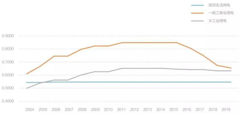 即使需要補(bǔ)貼居民電價和農(nóng)業(yè)電價帶來的電費(fèi)缺口,2018年和2019年中國還是連續(xù)兩年每年降低了10%的工商業(yè)電價,給用電企業(yè)減負(fù)。瞅瞅這電價曲線圖,一目了然——