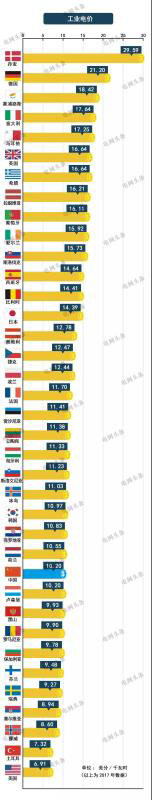 中國的工業(yè)電價在37個國家中排名并列第27位,低于大多數(shù)國家。排名第一丹麥,是咱們的3倍左右。