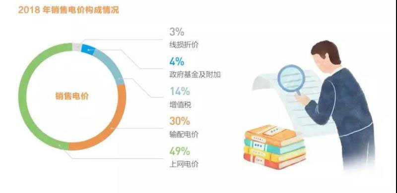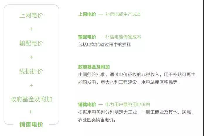 我們交電費(fèi)時的電價叫做“銷售電價”。它由上網(wǎng)電價、輸配電價、線損折價、政府基金及附加4部分組成。
