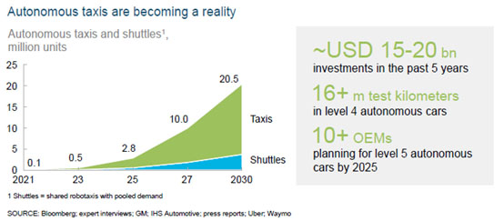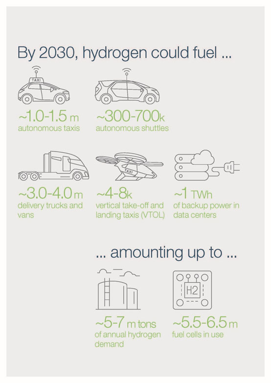 自動出租車和班車。完全自主的無人駕駛出租車和航天飛機應該在2020年左右上路。鑒于未來許多城市中心的零排放要求以及長距離駕駛和始終保持開啟的需求,他們可以從氫的高能量密度和快速充能中受益。由于它們在城市中運行,因此對氫基礎設施的較低空間要求可實現(xiàn)快速且經(jīng)濟有效的擴展。到2030年,大約100萬至150萬輛自動出租車和大約30萬至70萬輛自動穿梭機可以由氫燃料電池提供動力(2030年總共大約2050萬輛自動出租車和公路上的班車)。