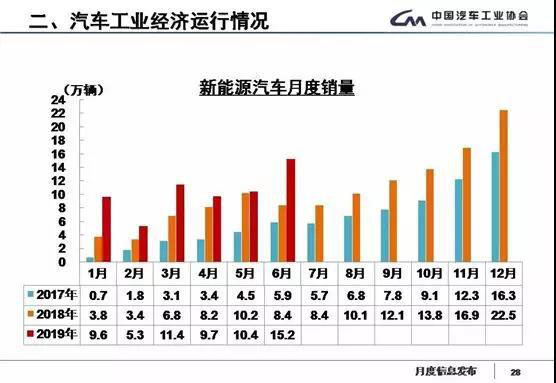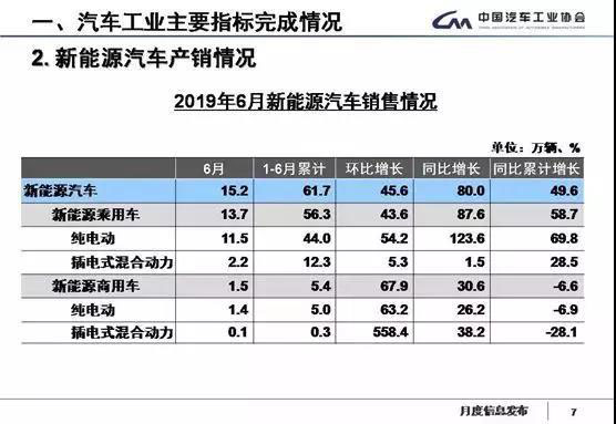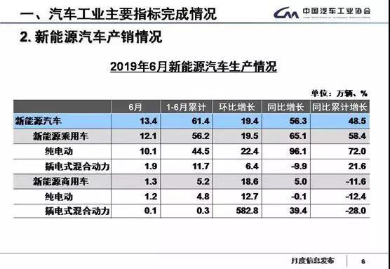 7月10日,中國汽車工業(yè)協(xié)會發(fā)布2019年汽車工業(yè)經(jīng)濟運行情況。其中,在新能源汽車市場,6月實現(xiàn)產(chǎn)銷量分別13.4萬、15.2萬輛,同比增長56.3%、80%;1-6月實現(xiàn)產(chǎn)銷量61.4萬輛、61.7萬輛,同比增長48.5%、49.6%。