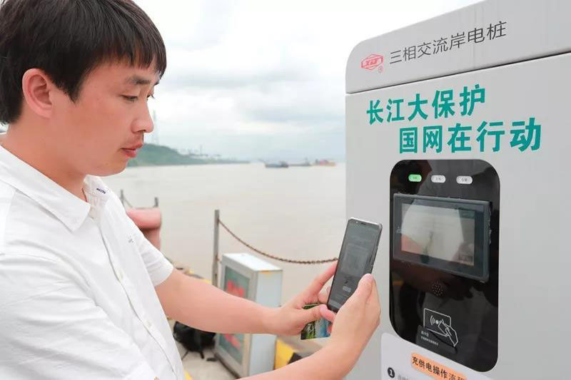 岸電客戶在湖北宜昌云池港通過(guò)移動(dòng)支付掃碼使用清潔電能。(陶桃)
