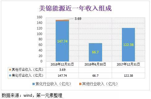 從上圖可以看出,美錦能源近一年來主要收入源于焦化行業(yè),其收入占到了總收入的97.56%,2017年更是達到100%。