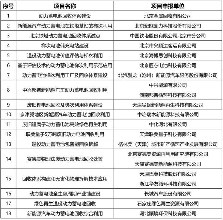 隨著新能源汽車推廣量不斷增加,動力電池回收正在變得越來越迫切。近日,北京、天津、河北共同組織開展了,京津冀地區(qū)新能源汽車動力電池回收利用試點(diǎn)示范項(xiàng)目的遴選,共有18個(gè)動力電池回收及再利用項(xiàng)目入選。