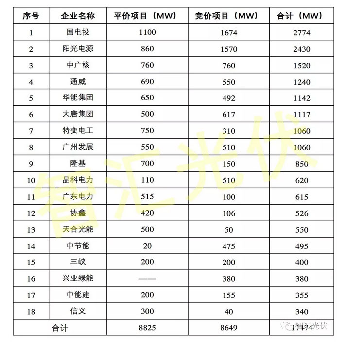 根據(jù)之前公布的第一批平價上網(wǎng)結果,以及剛剛結束的競價項目結果,主要電站投資企業(yè)斬獲的項目規(guī)模如下表所示。