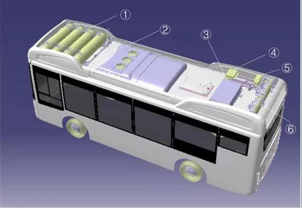 燃料電池汽車的碰撞安全主要包括儲氫系統(tǒng)、氫氣管路、燃料電池堆、各類閥門、連接頭等關(guān)鍵部件在發(fā)生碰撞時不能遭受破壞。目前,對燃料電池氫安全的碰撞防護設(shè)計除了關(guān)鍵零部件具有防撞能力外,主要通過位置布置、固定裝置保護和慣性開關(guān)監(jiān)控碰撞并與整車監(jiān)控系統(tǒng)聯(lián)動,自動斷電、自動關(guān)閉閥門等措施來避免災(zāi)難的發(fā)生。例如,燃料電池混合動力客車的高壓儲氫瓶一般放在車輛前置頂部,燃料電池模塊放在客車后置頂部,動力電池放置于地板下方。前置的儲氫瓶,通過車頂部的管路與車輛后部的燃料電池系統(tǒng)連接,在發(fā)生泄露時,氫氣可以迅速排放到大氣中去。燃料電池模塊對車身結(jié)構(gòu)基本無影響,而動力電池放置在地板下方,則兼顧了車身重心低穩(wěn)定性好,如圖2-2所示。